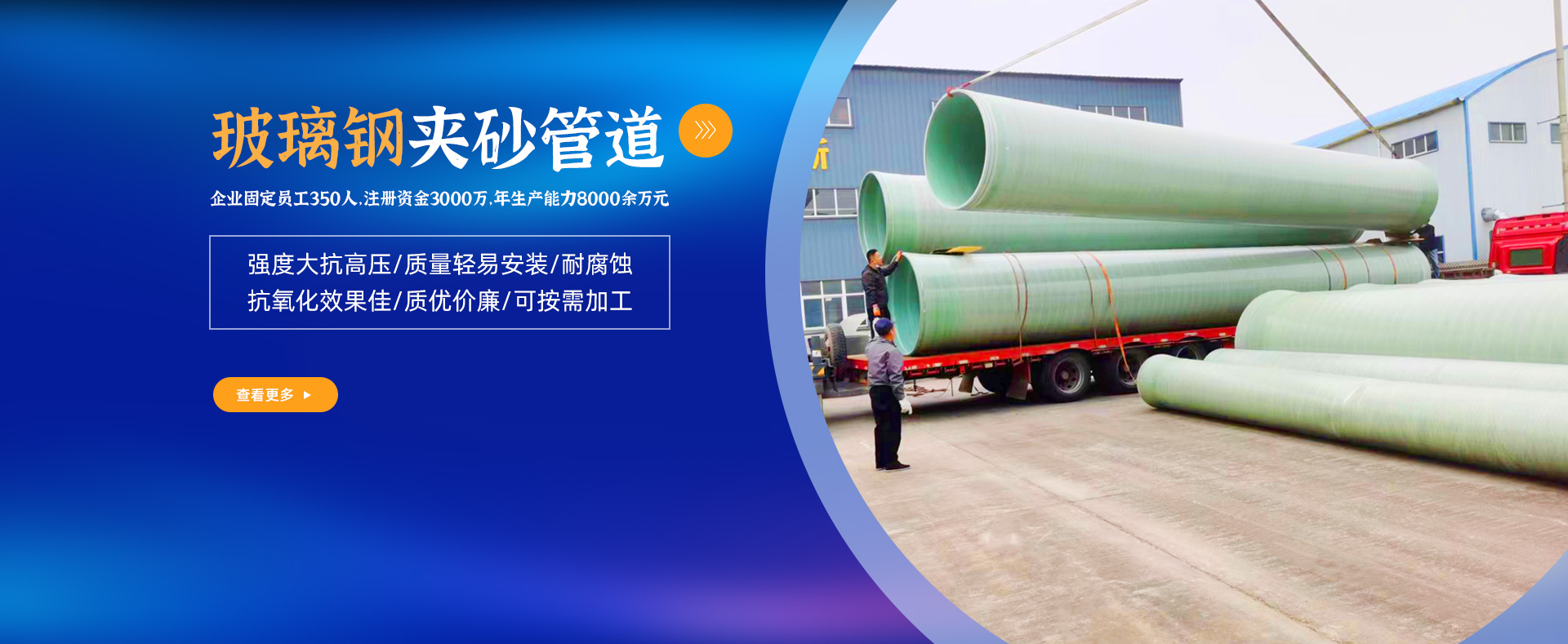 占地3萬平方米,建筑面積1.2萬平方米,企業(yè)固定員工350人,注冊資金3000萬,年生產(chǎn)能力8000余萬元,屬國內(nèi)目前玻璃鋼行業(yè)規(guī)格較大的廠家之一
